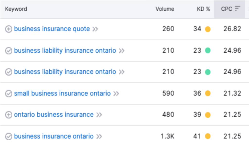 Keyword research showed that business insurance-related terms had a CPC almost 10x higher than personal insurance keywords. But they also had good organic traffic numbers and attainable difficulty scores.