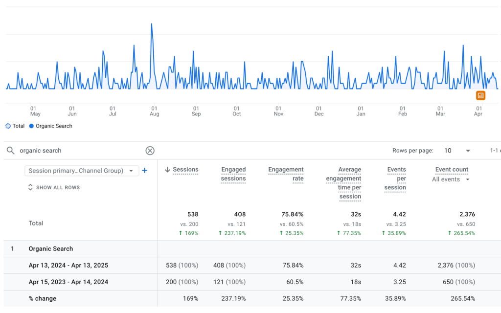 After a year of working together, we saw organic traffic to their business insurance pages increase 169%, and clicks to their overall website nearly doubled.